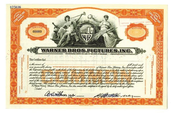 California. <100 Shares Specimen Stock Certificate. Black print with an orange border and under tint. Vigentte of allegorical females next to the Warner Brothers logo. Specimen overprints, POC's, and are XF condition. ABNC.