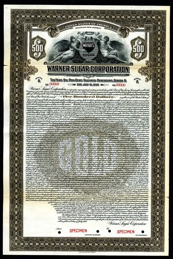 Warner Sugar Corp. 1925 Specimen Bond. NJ, $500, Specimen 6% Gold Coupon Bond, Black on brown border, Allegorical angels flank Warner's Sugar logo, Coupons attached, Fine with horizontal fold edge splits, ABNC. Scarce.