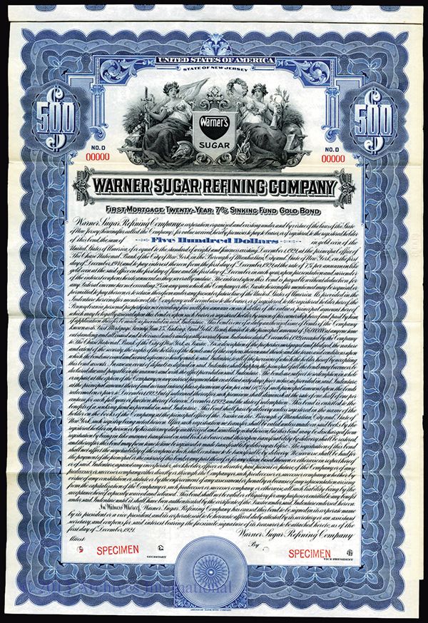 Warner Sugar Refining Co. 1921 Specimen 7% Gold Coupon Bond. NJ. $500, Specimen Bond, Black on blue border, allegorical women flank company logo, ABNC, XF.