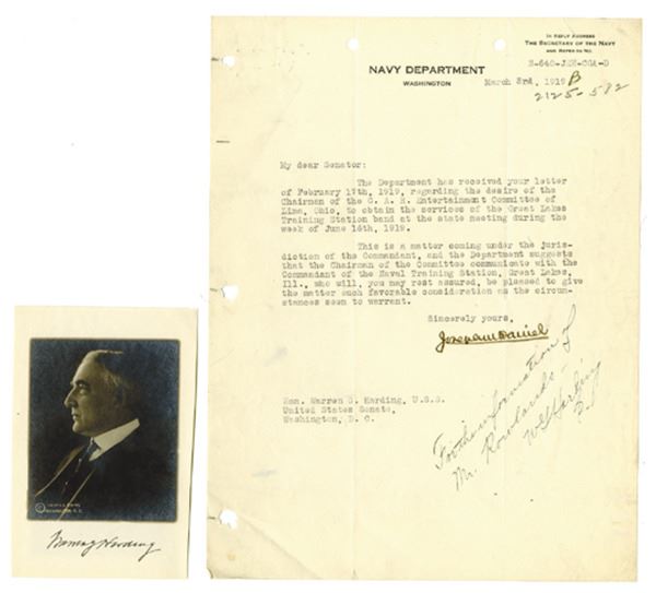 Letter from Warren G. Harding, at the time a United States Senator. Written on Navy Department letter head. Also included portrait of Harding with a printed signature. VF condition.