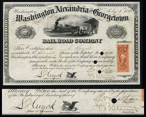 Virginia, 1866, 1000 Issued and Cancelled Shares, #74, Black print with black ornate border, Vignette top center of locomotive at station loading luggage and passengers, 25 cent brown-red Washington Internal Revenue stamp (R44) on right, VF condition, ABNC. Very rare listed Railroad stock.