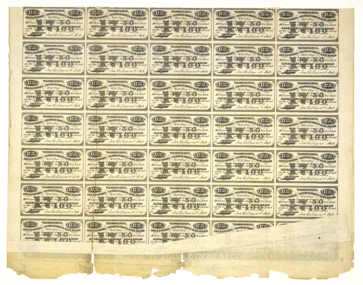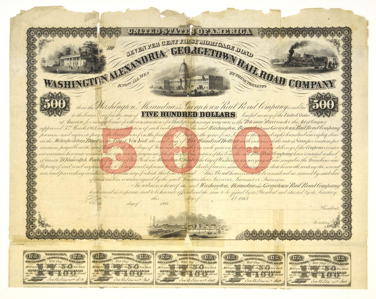 Washington, D.C., 1863 Specimen $500, 1st Mortgage 7% Coupon Bond. Horizontal format, Black with red "500" undertint. U.S. Capital in middle, upper right Locomotive being boarded and upper left with stately manor, bottom with river or harbor view, Good to VG condition due to faults, tears, taped reinforcement from back at vertical folds and small chips out of the top margin and a few small holes near the bottom, 40 coupons attached, POC's, "00000" serial numbers and POC's. ABNC. Spectacular and unique bond from ABNC archives. Rarely do you find specimen railroad bonds from the Civil War time period. Though there are condition issues, this impressive certificate survived over 150 years relatively intact and would be the centerpiece of any advanced railroad collection. Unlisted as a bond in Cox.