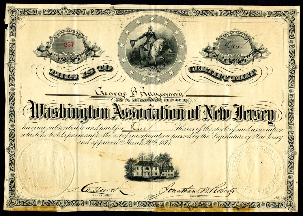 New Jersey, 1 Share, I/U, Black on light tan paper, extremely attractive certificate with George Washington on horseback holding his hat in circle with stars over title with building on bottom, S/N 257, National BNC. Appears VF but there is toning on the bottom border, a few small pin holes and minor edge faults on the left, rare and first time seen by cataloger.