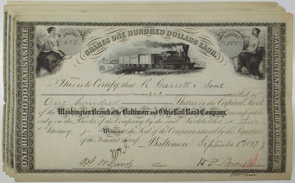 Baltimore, MD. Lot of 8, I/C Capital Stock Certificates, black text with black border, locomotive L-R under curved title at top flanked by allegorical women at top corners. POCs, 3 examples in VF condition and 5 in Fine condition with rough right borders, TCC&C. 8 pieces.