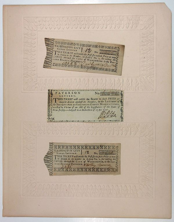 New Jersey and Washington, D.C., ca.1780-1796, Lottery tickets (3), two hinged to a decorative page) for the 1796 fund-raising effort. George Washington had begun the Potowmack Company in 1785 to improve navigation on the river, and this idea continued in the years following. A canal was finally finished and opened in 1815. AU to Uncirculated with slight toning on the bottom example.