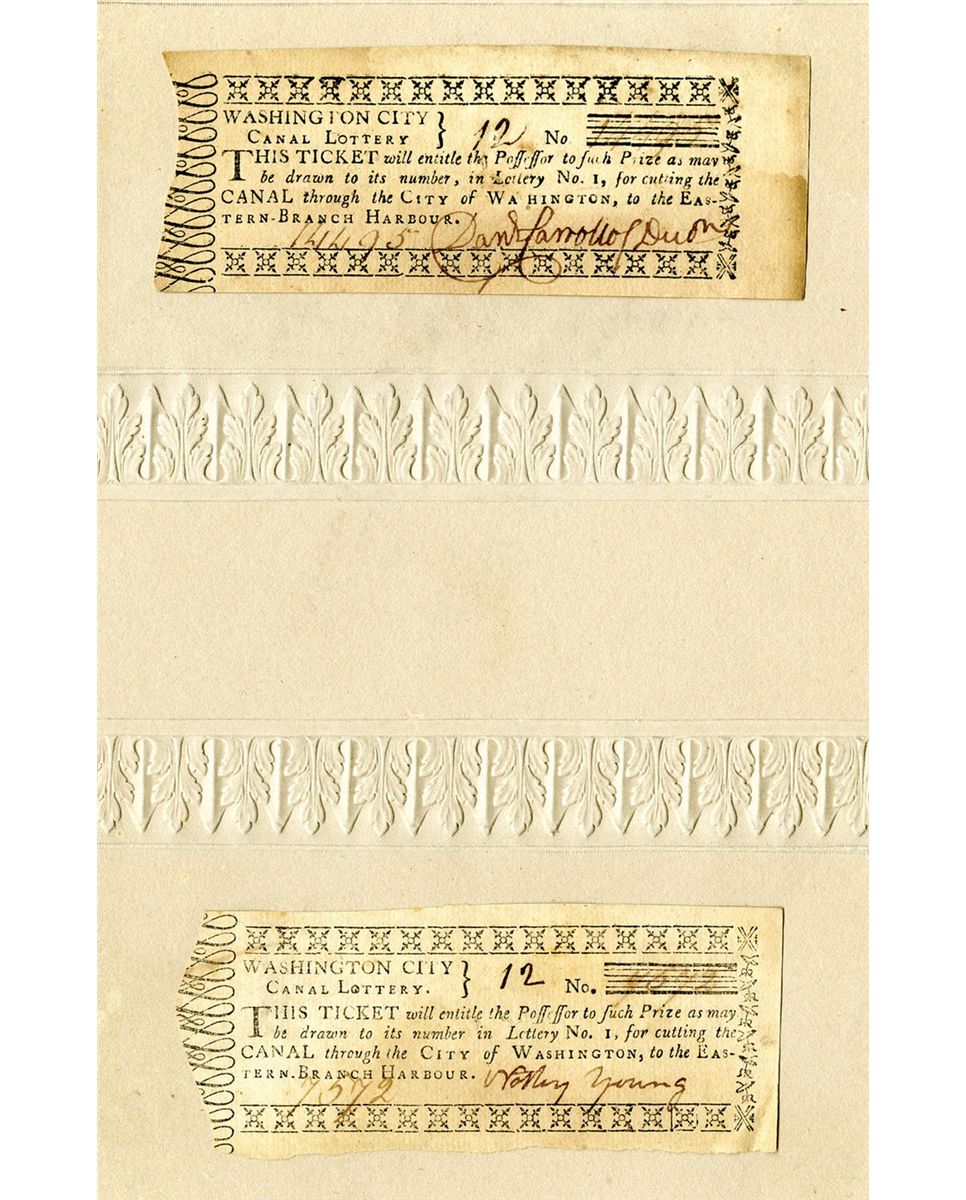 Two additional lottery tickets similar to above (2) hinged to a decorative page, AU with stains on bottom.