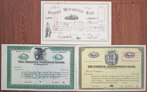 Washington, D.C...... 1877-1920. Lot of 3 pieces: National Metropolitan Bank of Washington Specimen Capital Stock Certificate; National Metropolitan Bank 50 Shares I/C Capital Stock Certificate; Munsey National Bank of Washington Specimen Capital Stock Certificate. All are in VF condition. (3)