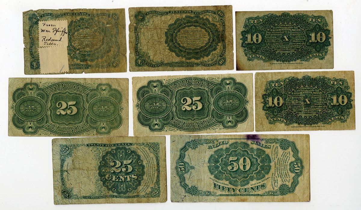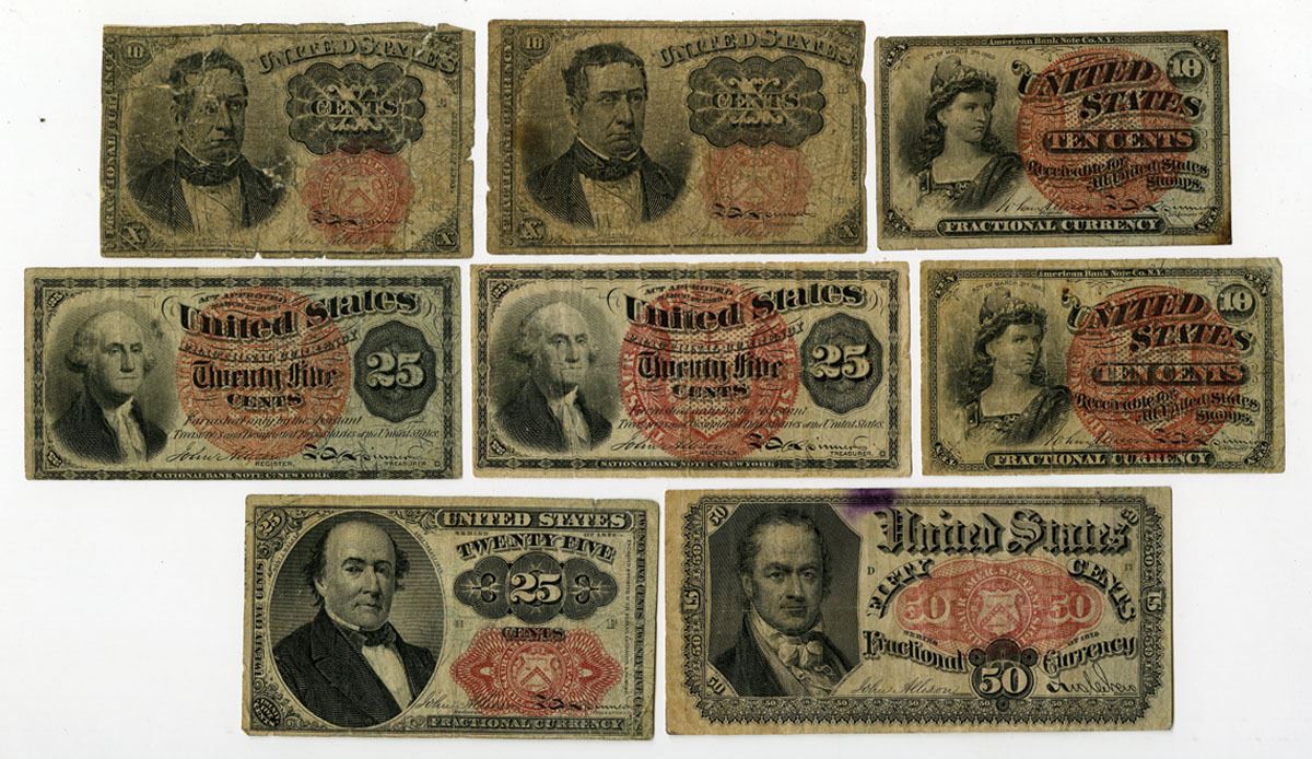 Washington D.C., 1863. Lot of 7 Fractional Currency Issued Banknotes, Includes: 10 Cents, P-115d (2), Fr.# 1261, Fourth Issue, ABNC; 25 Cents, P-118b, Fr.# 1302 and P-118d, Fr.# 1307, Fourth Issue, NBNC; 10 Cents, P-122c (2), Fr.# 1266, Fifth Issue, BEP; 25 Cents, P-123b, Fr.# 1309, Fifth Issue, BEP; 50 Cents, P-124, Fr.# 1381, BEP. Notes range from Good to XF condition. (7). Sold "AS IS" no returns accepted.