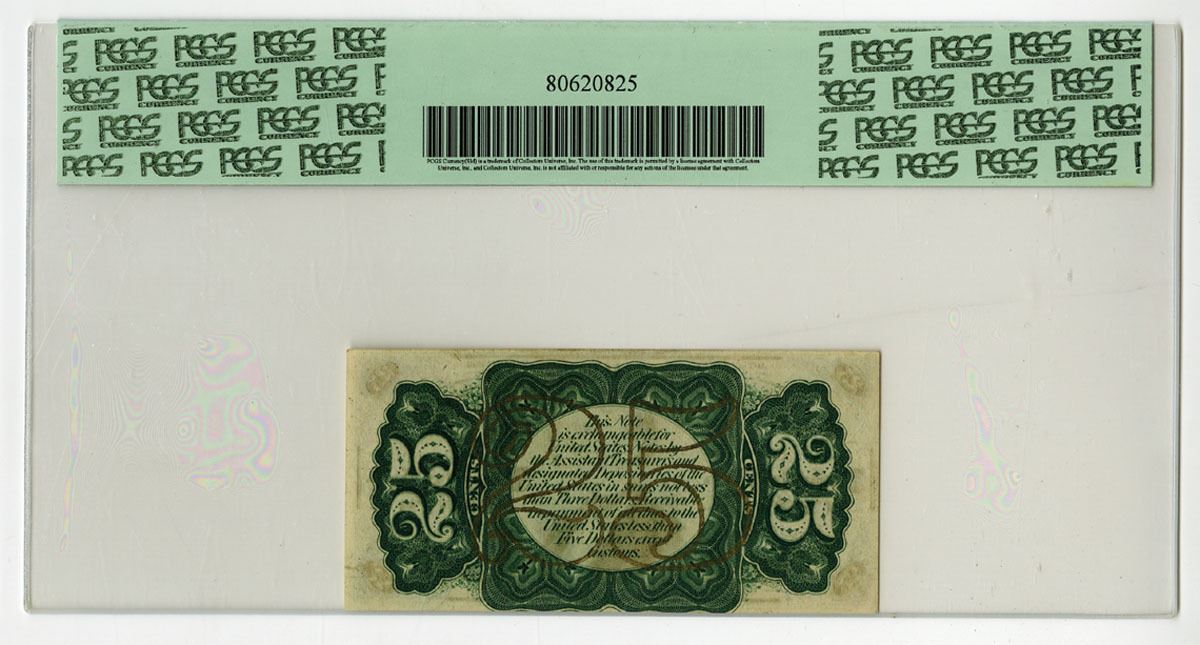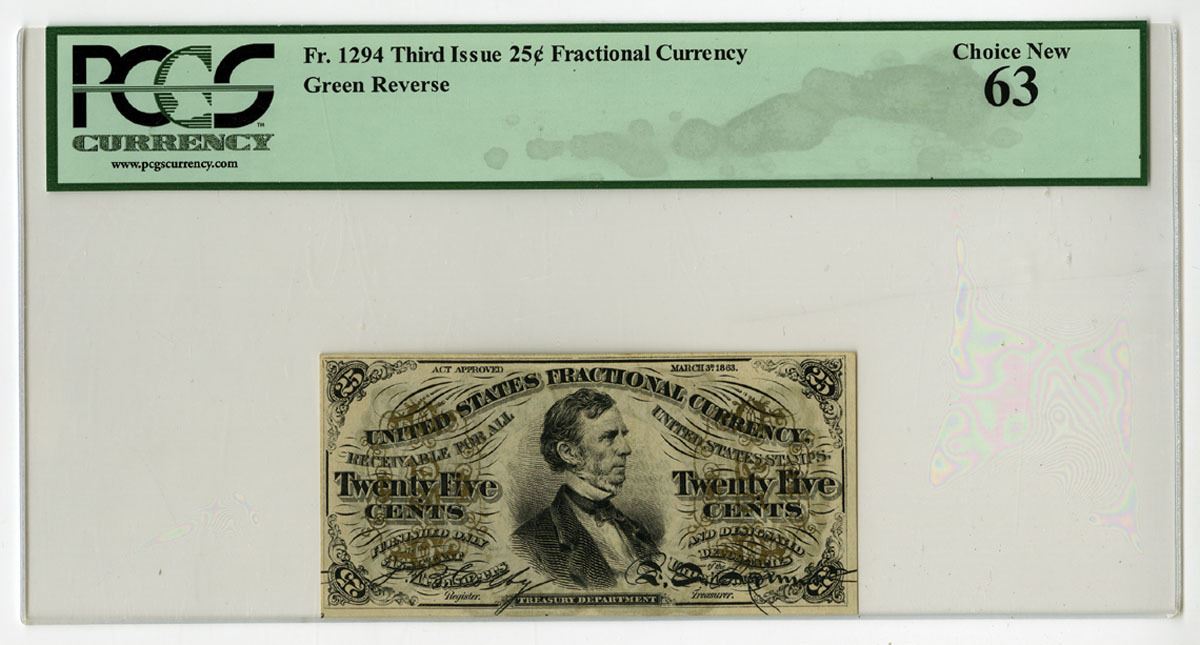 Washington D.C., 1863. 25 Cents Third Issue, P-109d Fr.# 1294, Issued Banknote, Black with bronze overprint and portrait of Fessenden at center, Back is green with bronze '25' overprint, PCGS graded Choice New 63, TD.
