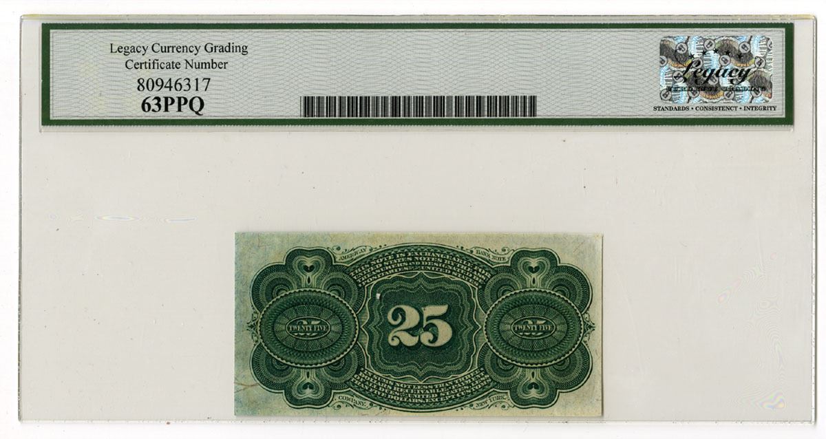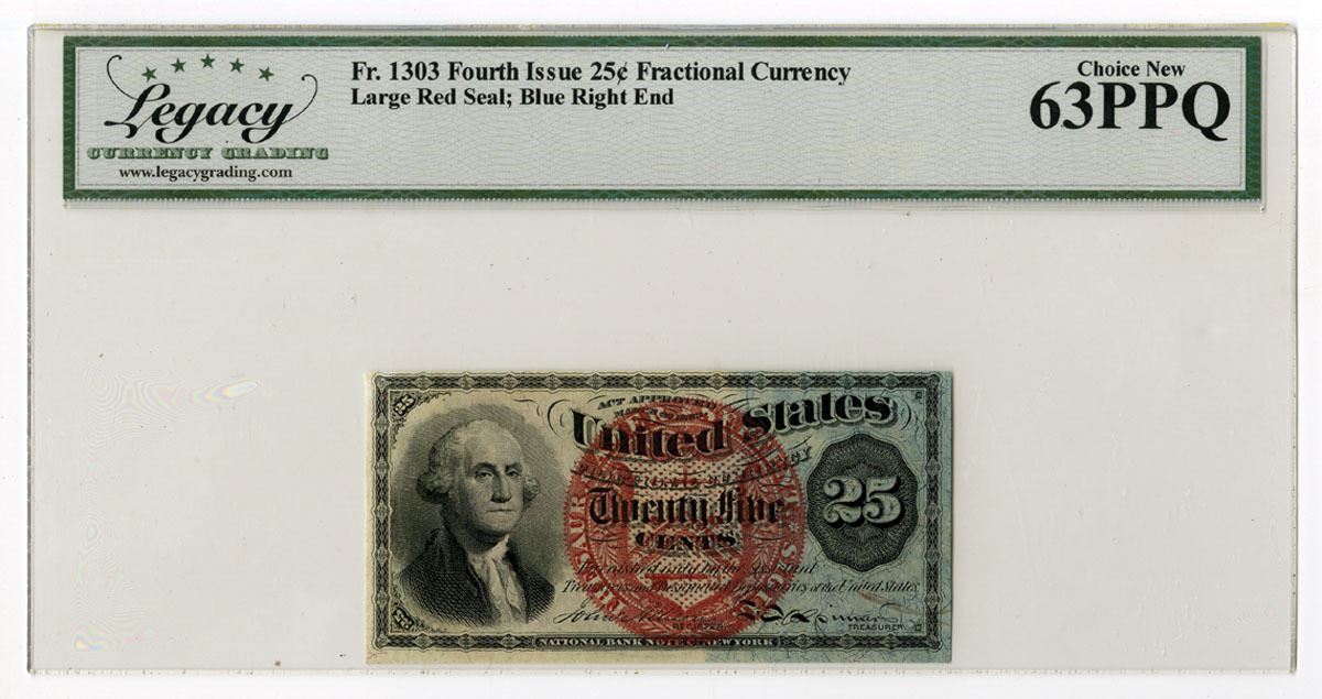 Washington D.C., 1863. 25 Cents Fourth Issue, P-118c Fr.# 1303, Issued Banknote, Black printing with blue tint at right, Portrait of George Washington at left with large red seal at center, Back is green with denomination at center, Legacy graded Choice New 63PPQ, NBNC.