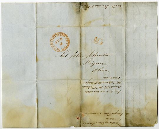 Washington, D.C...., 1848 stampless cover, addressed to Piqua, Ohio, red "10" handstamp, with handwritten letter that is 3 pages long, regarding a property account. Fine condition with staining and toning.