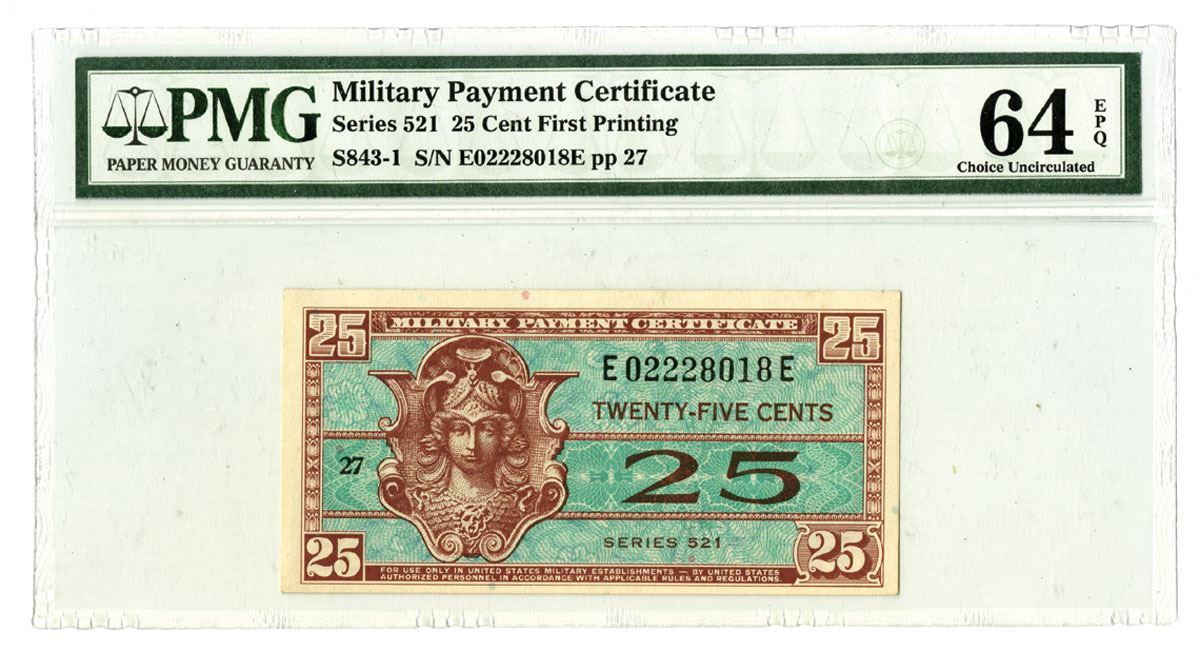 Washington, D.C., ND (1954). 25 Cents, P-M10a S843-1, First Printing Issued Payment Certificate, Brown on green underprint with woman wearing helmet at left, Back is m/c with woman at center, S/N E02228018E pp 27, PMG graded Choice Uncirculated 64 EPQ.