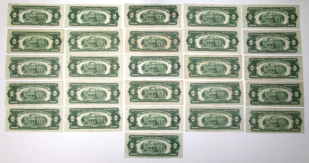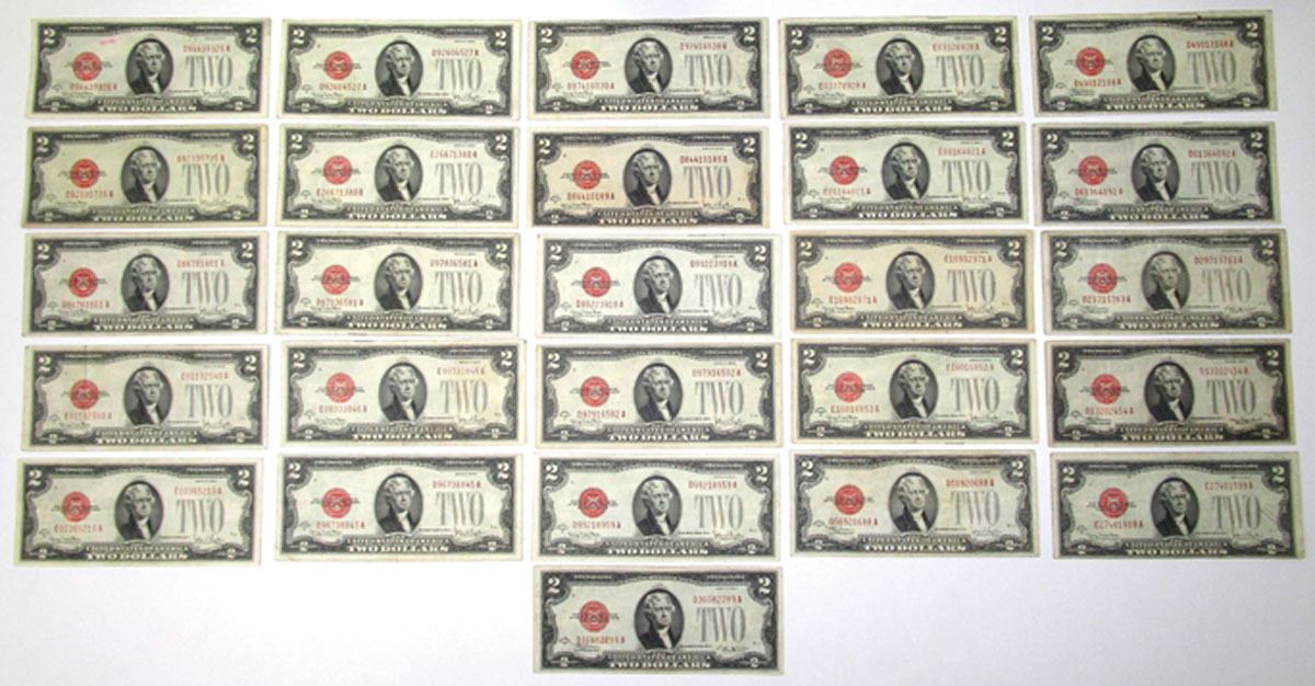 Washington D.C., 1928. Lot of 26 Issued Banknotes, Includes: 2 Dollars, P-378d Fr.# 1505, Series of 1928D; 2 Dollars P-378e (2) Fr.# 1506, Series of 1928E; 2 Dollars, P-378f (3) Fr.# 1507, Series of 1928F; 2 Dollars, P-378g (20) Fr.# 1508, Series of 1928G. Notes all have Thomas Jefferson at center with Red seal at left. Notes range from Fine to XF condition. (26). Sold "AS IS" no returns accepted.