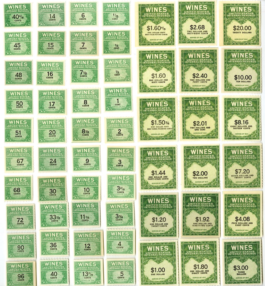 Washington, D.C. US Wine Revenue Stamp Collection, 1/5 cents to $20.00, 1941 Wine Stamp collection, All with OG with excellent centering, (50+)