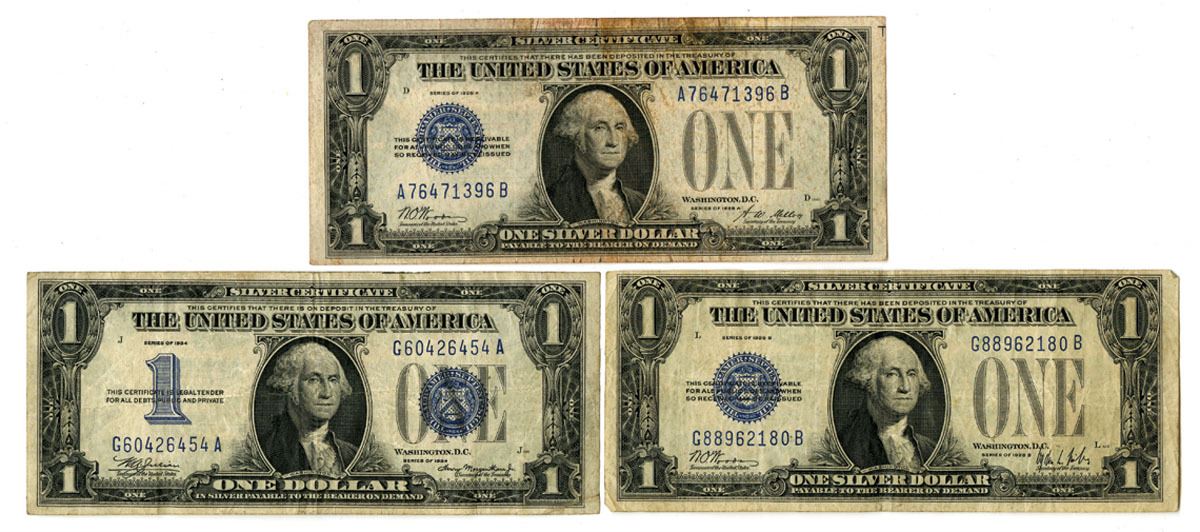 Washington D.C., 1928-1934. Lot of 3 Silver Certificates, Includes: $1, P-412a, Series of 1928A, Fr.# 1601, Woods | Mellon Signatures, Blue seal at left; $1, P-412, P-412b, Series of 1928B, Fr.# 1602, Woods | Mills Signatures, Blue seal at left; $1, P-414, Series of 1934, Fr.# 1606, Julian | Morgenthau Signatures, Blue seal at right. Notes range from Fine to VF condition with stains. (3). Sold "AS IS" no returns accepted.