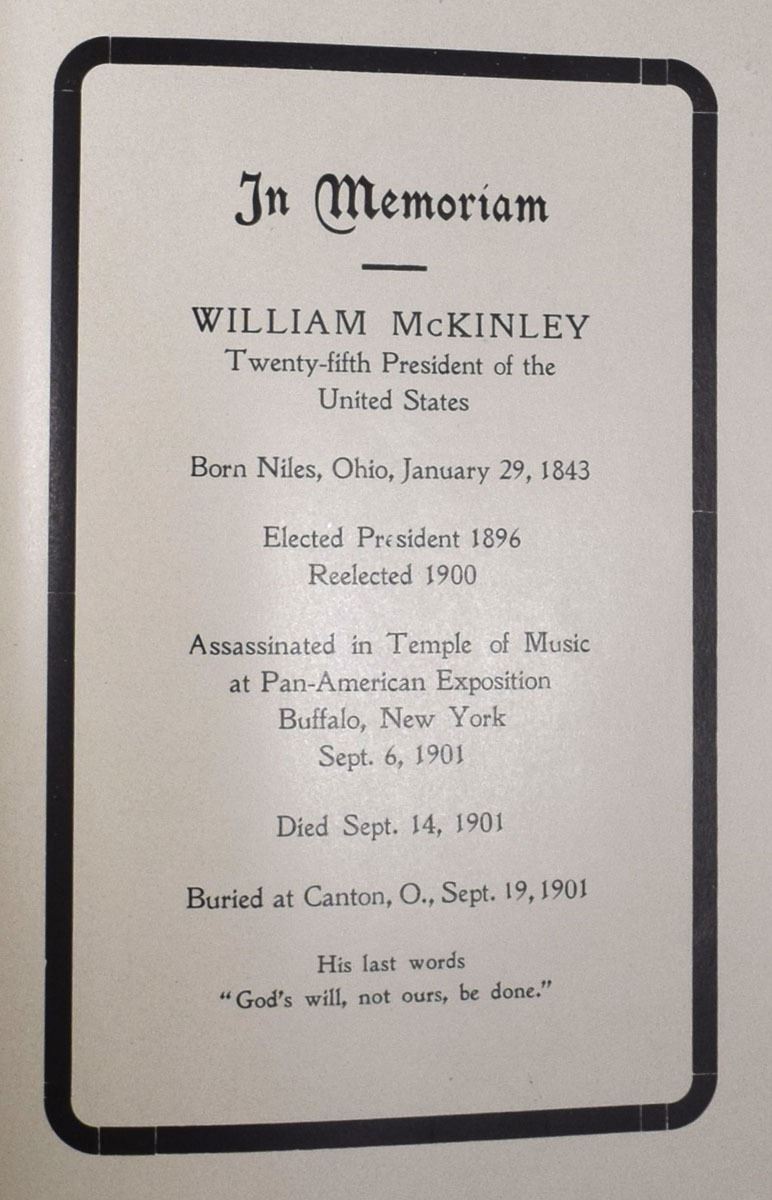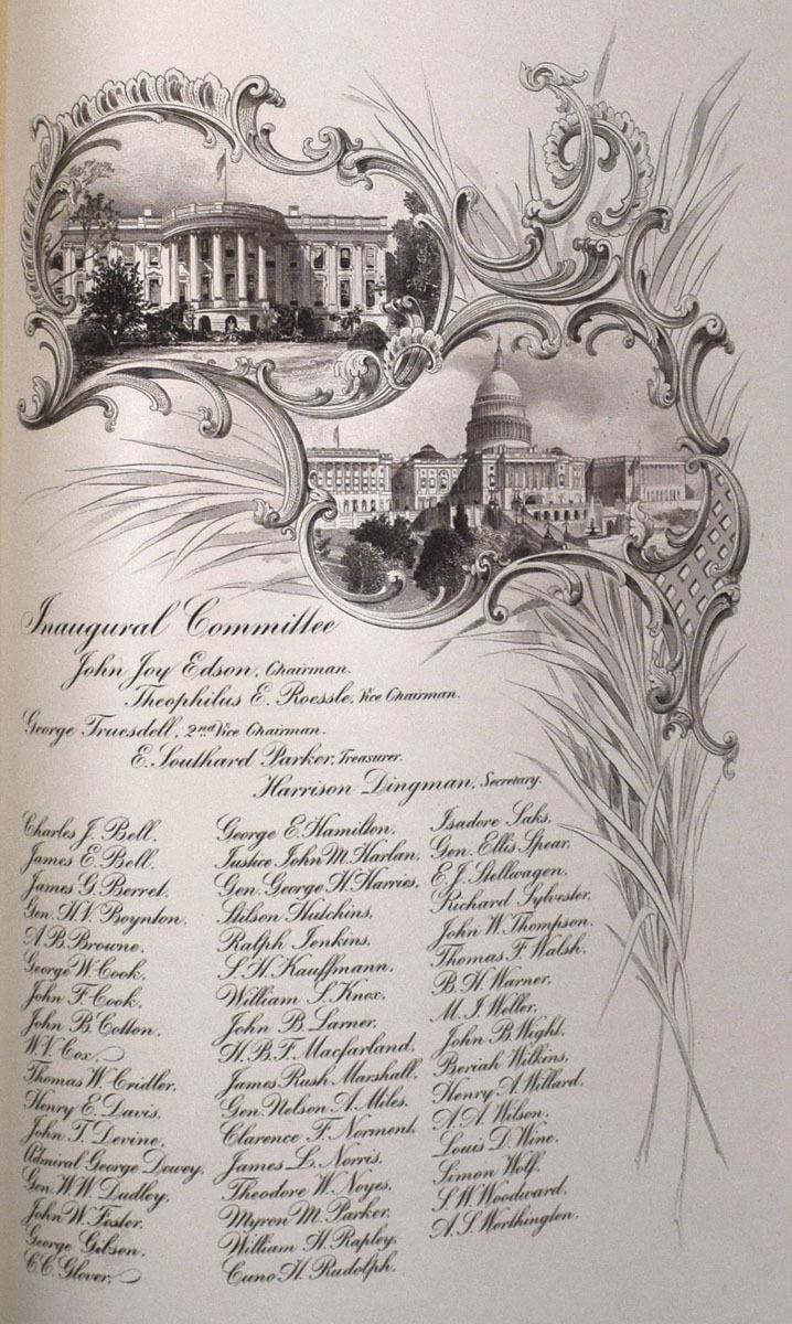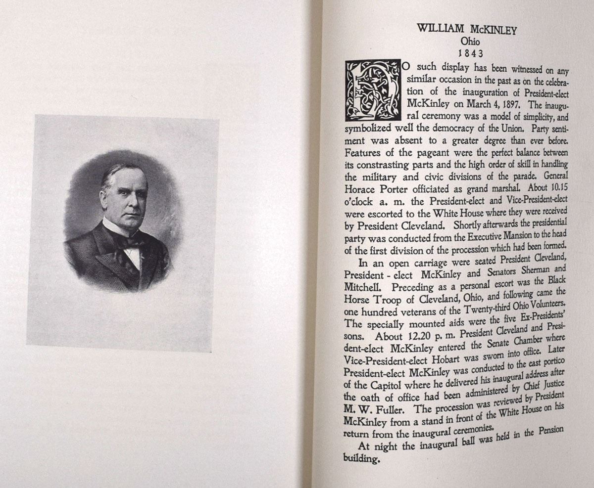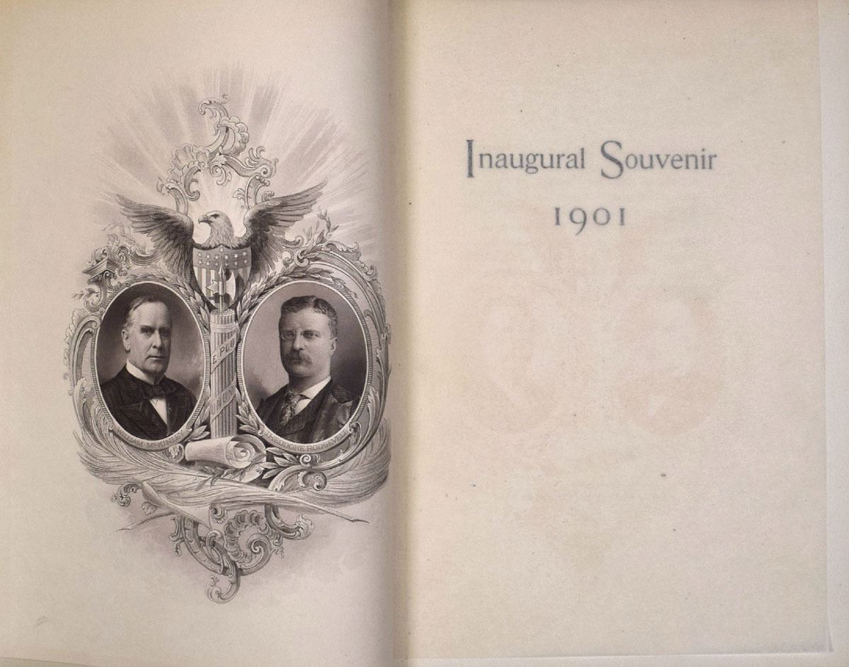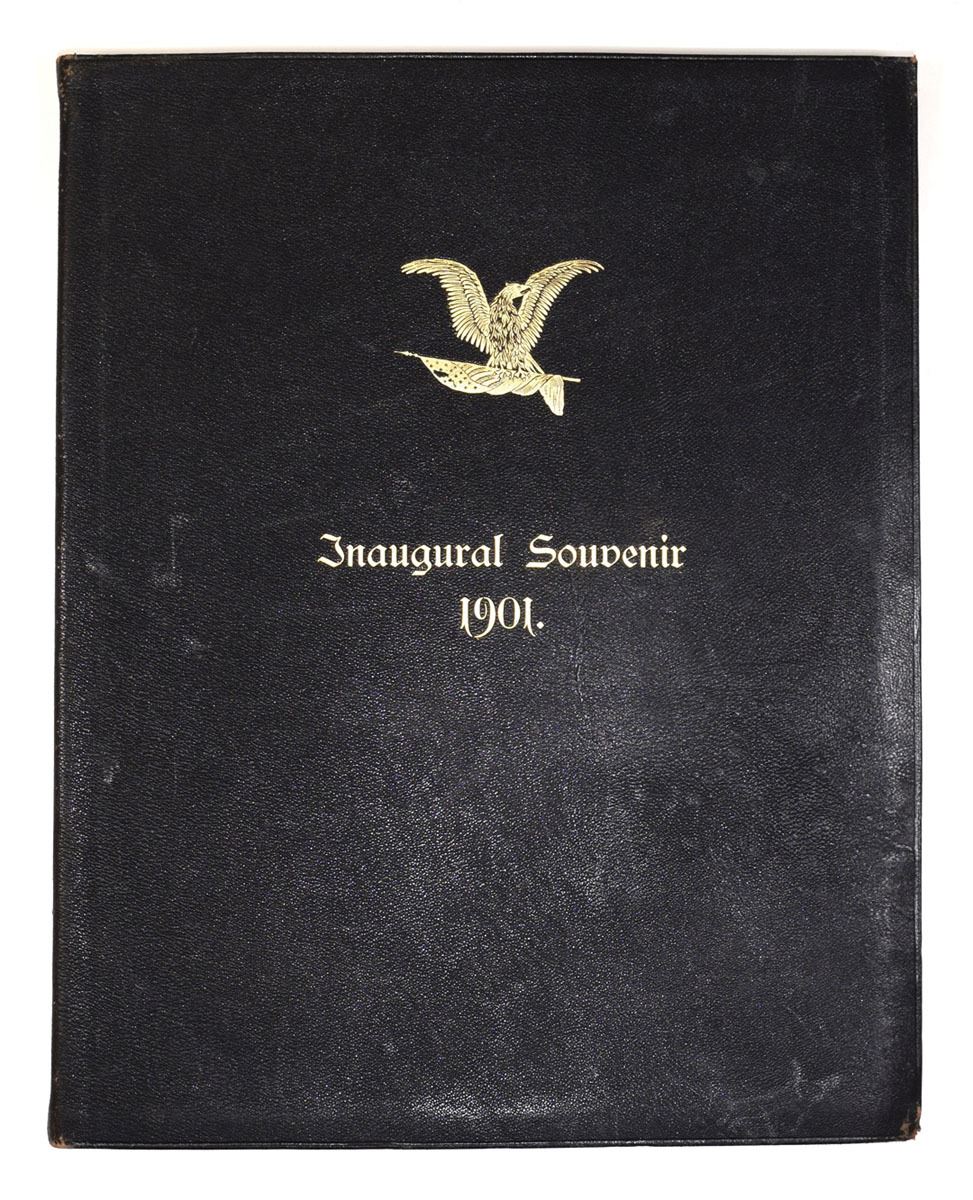 Washington, D.C., 1901. Rare commemorative volume, bound in full black morocco with gilt eagle on cover, issued for the inauguration of President William McKinley and Vice President Theodore Roosevelt. One of only 200 copies retained by the Inaugural Committee, with no further printings produced. The volume includes engraved portraits of McKinley and Roosevelt in an ornate design at front; nine pages of halftones; and reproductions of steel-plate engravings by the Bureau of Engraving and Printing throughout. Additional features include a roster of Inaugural Committee members with engravings of the White House and Capitol; a reproduced photograph of Governor Dietrich of Nebraska and his staff at the 1901 inauguration; and portraits of other political figures, including James W. Templeton, who revised and rebound the work. Templeton's note records that while the volumes were in preparation, McKinley was assassinated, with an "In Memoriam" page inserted. A scarce and historically significant piece produced in the brief period between McKinley's inauguration and death, marking the rise of Theodore Roosevelt. Mint condition as printed. B.E.P. and pother printers.