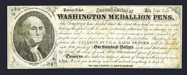Lottery ticket made to look like an Advertising note. Washington Medallion pens. ND. Washington portrait at left. Very Good.