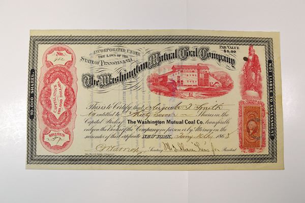 Pennsylvania, 1868, 37 Shares, #982, I/U stock certificate, Black with red Factory scene in middle and Allegorical standing Liberty on right, Revenue Stamp attached, XF condition, extremely attractive Corlies, Macy & Company design.