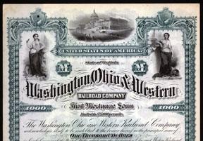 Virginia, 1884, $1,000, 6% first mortgage bond. Green border and underprint, with allegorical nude and topless women flanking the U.S. Capital in middle (I guess they knew something back then). FBNC (They usually punch cancelled their specimens and did not stamp them), Specimen with POC's and with coupons, EF, scarce and attractive bond.
