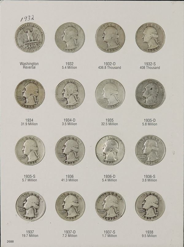 Collection of over 365 coins with $21 silver face value. Highlights include almost a complete run of Washington Silver Quarters dting from 1932 to 1964, in VG to VF condition, with some of the later dates better (365). (photo on web site)