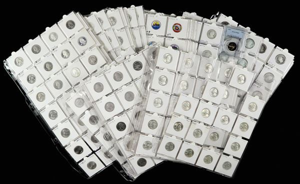 Outstanding collection of over 600 coins with close to $49 in silver face value. Highlights include almost a complete run of Washington Quarters minus the 1932 D and 1936 D coins, the balance in Choice AU to Uncirculated condition. Later issues in the 1960s include Uncirculated, Special Mint Set and Proof Issues. Also includes Silver Sets in proof and Uncirculated. Outstanding lot that would be nearly impossible to recreate. Includes close to $800 in bullion value. This collection was a serious collector's labor of love (600+). (photo on web site)
