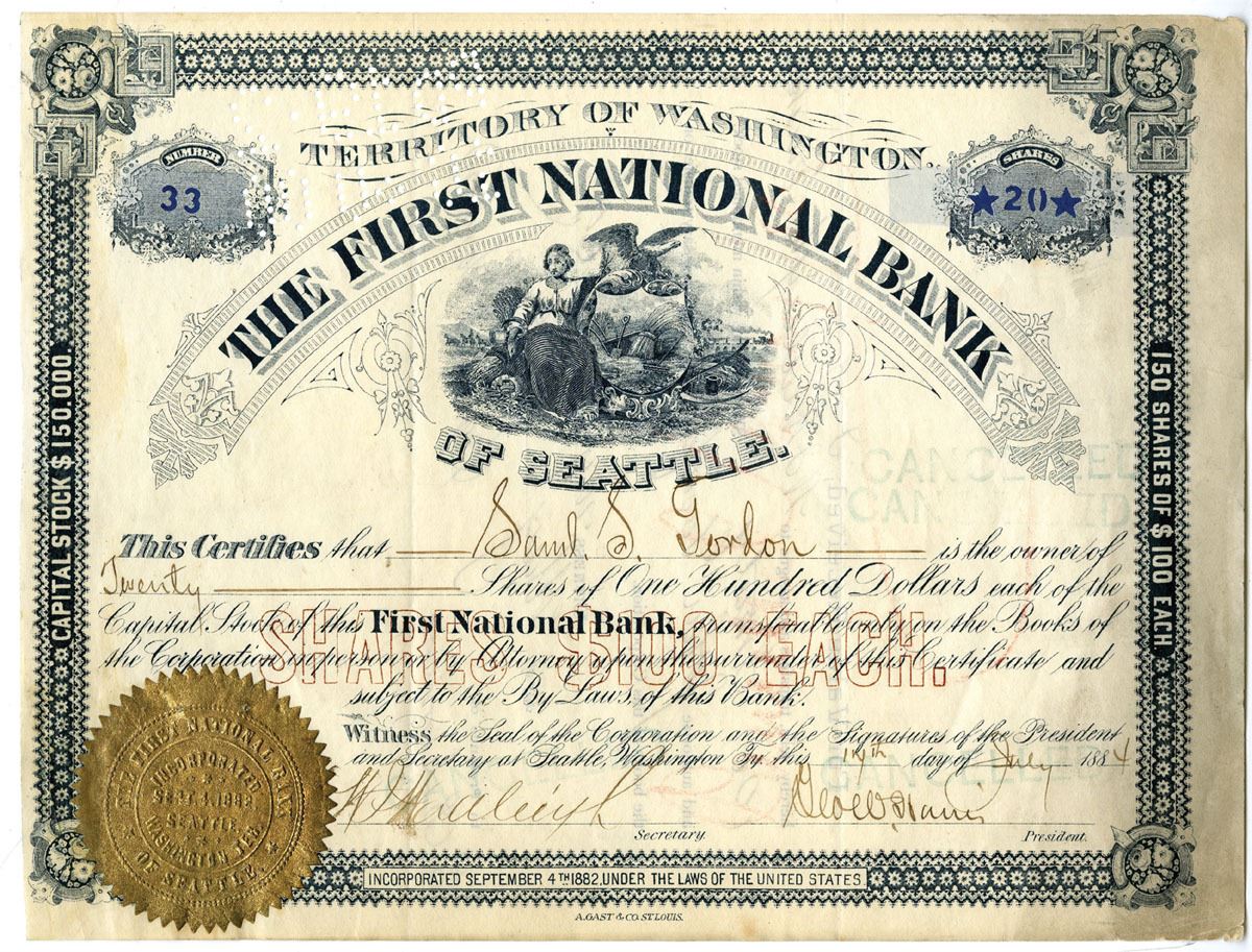 Washington Territory, 1884. 20 Shares I/C Capital Stock Certificate, S/N 33, Black text with black border, Allegorical woman with seal at center, gold embossed seal at bottom left corner. Fine condition with some toning, POCs. Printed by A. Gast & Co. Seattle First National Bank is the oldest bank in Seattle.