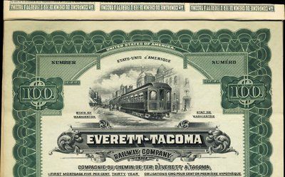 1910. $100.00. Specimen 1st Mortgage 5% Gold Bond. Text in French and English on front. Green border. Inter urban street car. POC's. XF condition. Coupons attached. Rare certificate. Unlisted railroad in Cox. SBNC.