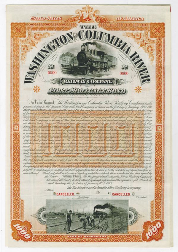 Washington. $1,000 Specimen 5% First Mortgage Coupon Bond, Black print on orange border and under tint, Locomotive at top with conductor standing nearby and men working on tracks at bottom, Cancelled overprints and POC's, VF-XF condition, ABNC.