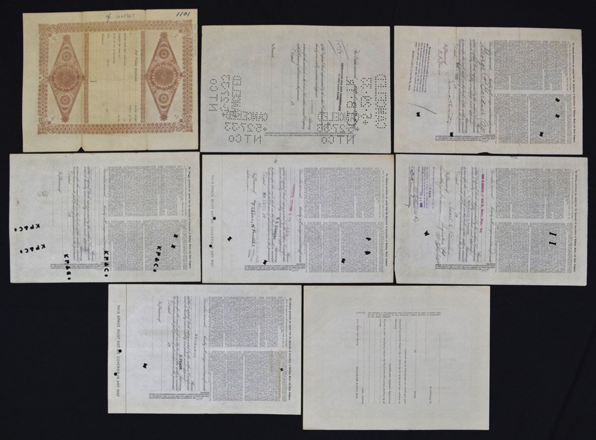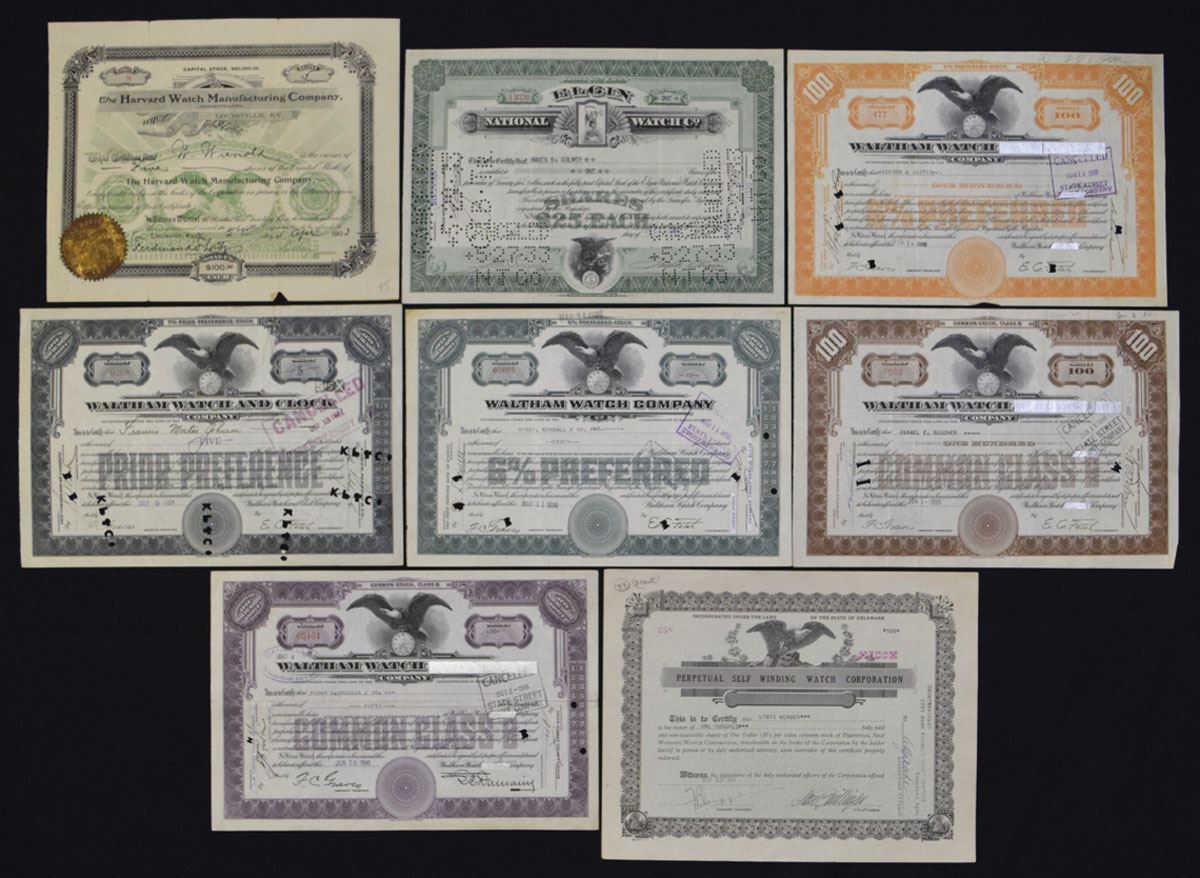Various States, 1903-1941. Lot of 8 I/U and I/C Stock Certificates for watch and clock manufacturing companies, featuring ornate engraved borders, eagle vignettes, printed and embossed seals, and manuscript signatures. Includes Harvard Watch Manufacturing Co.; National Watch Co.; Waltham Watch Co. (3), Waltham Watch and Clock Co. (2); and Perpetual Self Winding Watch Corp. Conditions range from VF to XF with typical cancellation holes, handling, and pen notations. (8). Sold ‘AS IS’ no returns accepted.