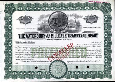 Connecticut. ca.1890's-1910. Odd Shs. Specimen stock certificate. Red specimen "Cancelled - Security Bank Note Co.", red "Not to be removed from file" overprints and POC's. Green border. Vignette of water powered metal or iron roller flanked by electric and horse drawn street cars. XF condition. Unique in archive. SBNC.