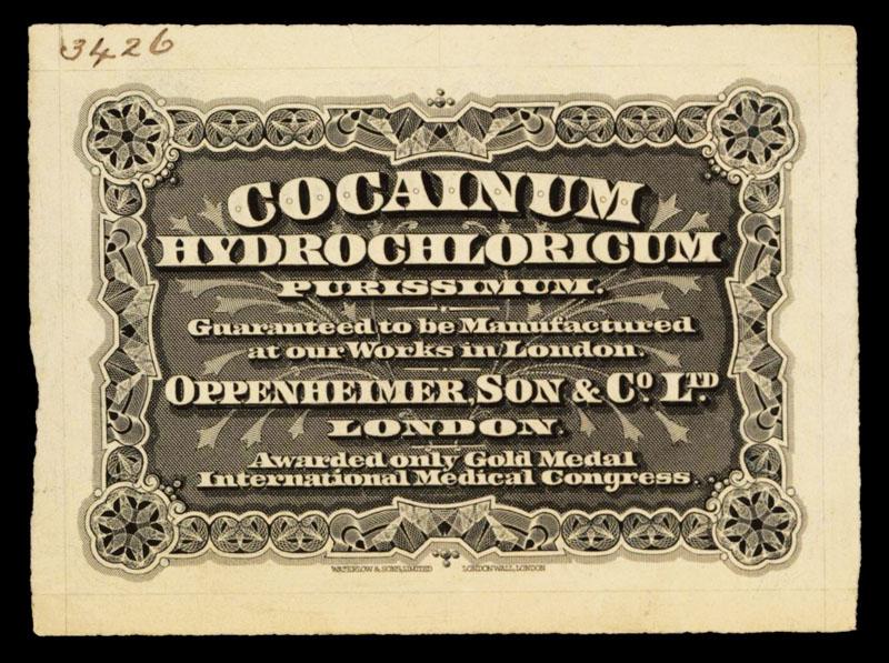 Waterlow Medical Label Proof Cocainum Hydrochloricum.London, England, ND (1880's), Proof Cocaine medical label from Waterlow & Sons archive, Black on white paper, Plate # on top left, back blank. Rare Cocaine related label as well as Waterlow proof. W&S.