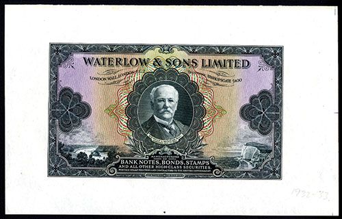 London. ND (ca.1932-1933). Face is dark blue on m/c underprint with text describing their printing services including “Banknotes, Bonds and Stamps” on white paper with large margins. Portrait of Sir Philip H.Waterlow, Chairman, in middle, Back is blue and m/c with text describing company's printing services. XF+ to AU condition. W&S. Scarce advertising note variety.