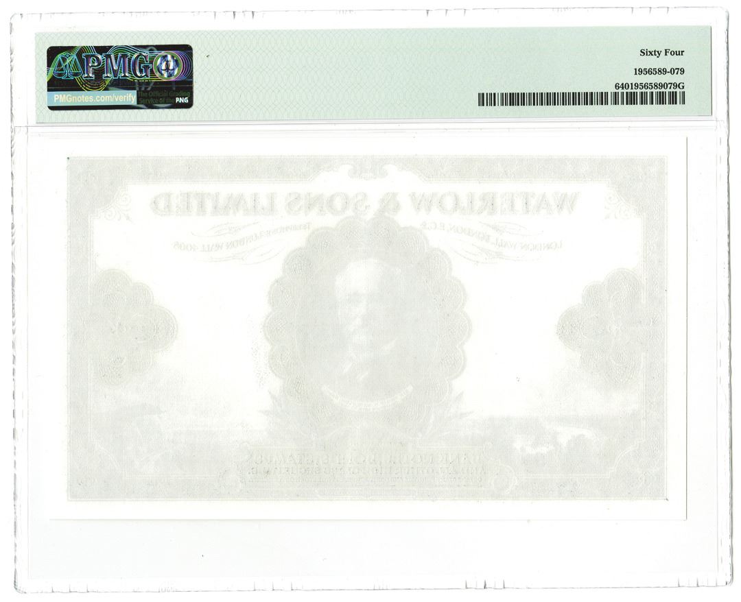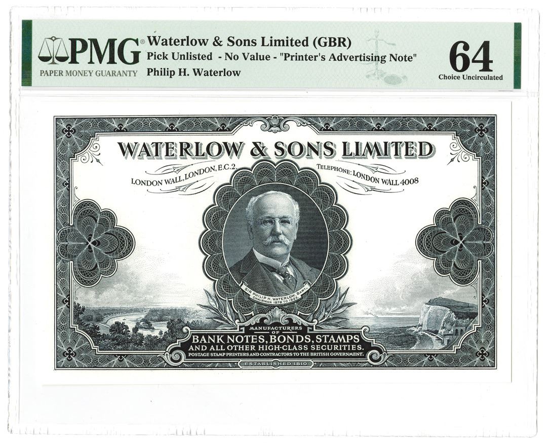 Great Britain. Waterlow & Sons Limited, Black with portrait of Sir Philip H. Waterlow in middle, flanked by river and seashore, back blank, printed on white paper. PMG graded Choice Uncirculated 64. Attractive and rare Printers advertising note.