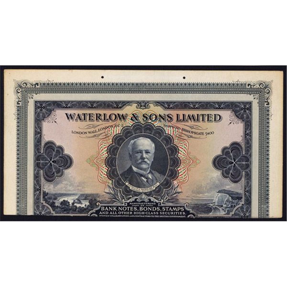 London, England, ND, (ca.1920-30's). Sir Philip H. Waterlow Portrait in middle flanked by ocean and river scenes, black on m/c with ornate frame on top and sides but the bottom part has been cut off, back blank with glue remnants and 2 small holes in the top margin. W&S. Scarce advertising note variety.