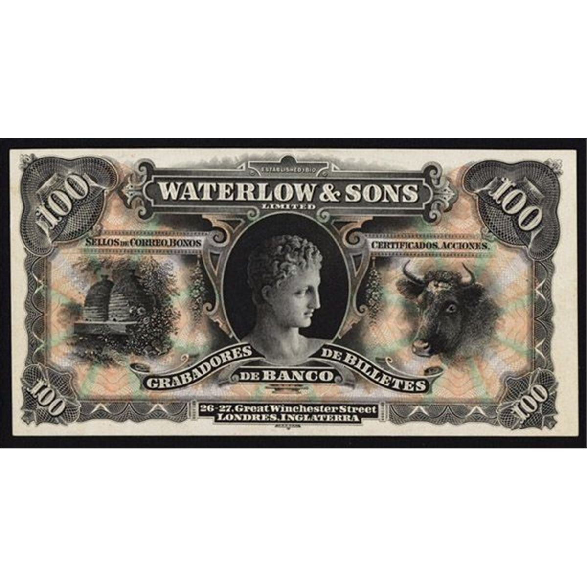 London, England, ND, (ca.1930's). Specimen or Proof, Spanish Language advertising banknote for Waterlow & Son using vignette of marble bust used on Early Greek banknote with beehive and bull, black on red, blue and m/c, back blank, Spanish text has “Grabadores De Billetes de Banco” and other text advertising their printing services in Spanish. AU to Uncirculated condition. W&S. Rare and attractive advertising note variety.