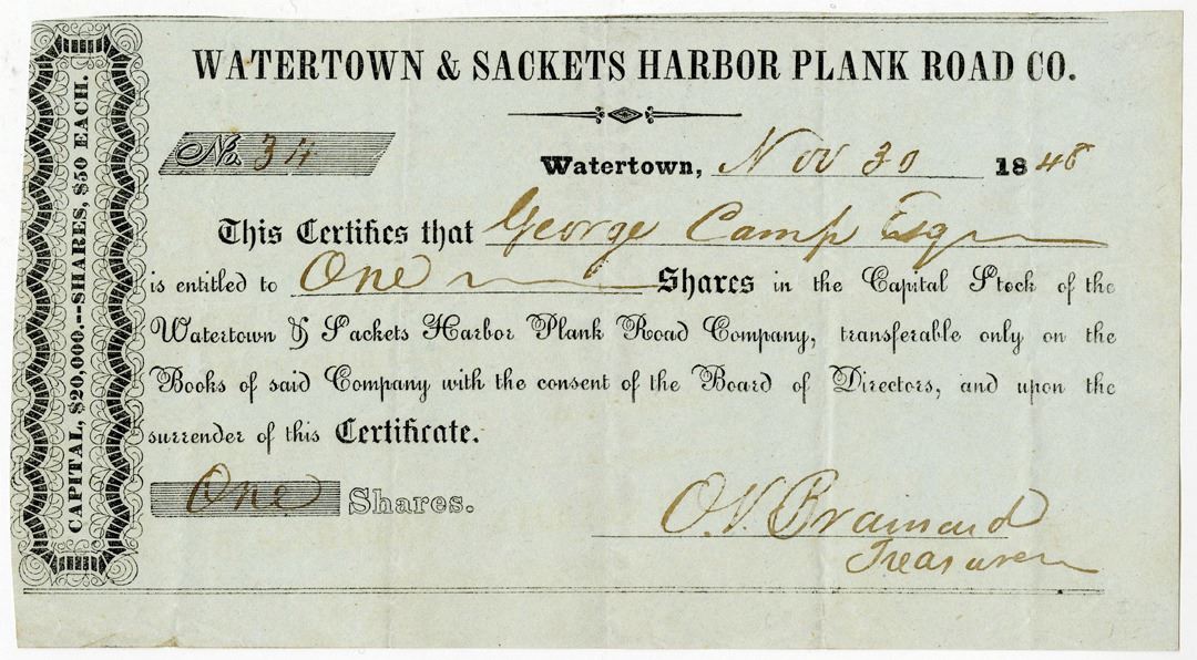 New York. 1848, 1 Share Capital Stock I/U Stock Certificate, Black print on black border printed on blue paper, Company title at top, Fine-VF condition.