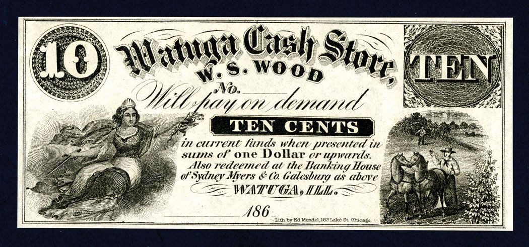 Watuga, Illinois, 10 cents, black on off white paper, Liberty at left, agricultural scene on right, counters on top, Unissued, Uncancelled, back blank, Uncirculated to CU. Attractive and scarce Illinois scrip note. Lith by Ed Mendell, Chicago.