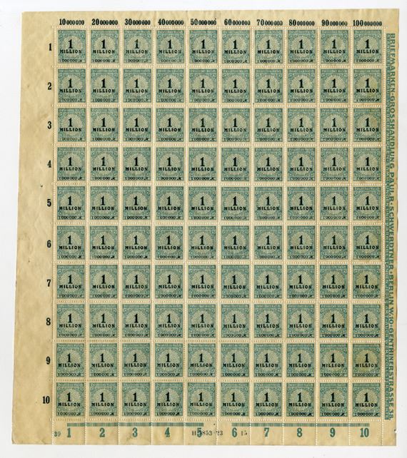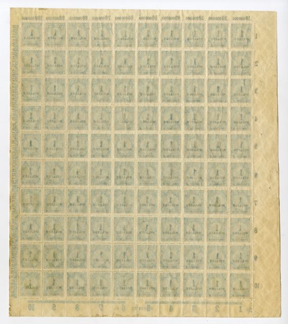 Berlin, Germany, 1920s. Uncut Sheet of 100 1 Million Mark Stamps, German printing along right margin stating sheet was printed by Paul R. Schwerdtner a stamp wholesaler with a shop in Berlin, Sheet is in Fine to VF+ condition.