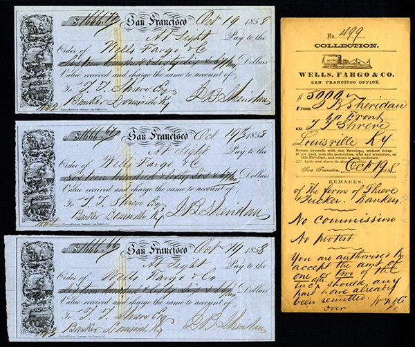 Wells, Fargo & Co. 1858 Trio of Checks with Wells Fargo Collection Envelope & Instructions. San Francisco, California and Louisville, Kentucky. 1858, Lot of 4 items. Includes Collection envelope with 3 checks, all are issued in San Francisco, payable to Wells, Fargo & Co. All 3 checks (amounts of $1666.66, $1666.67, and $1666.67) add up to $5000 and all were unpaid, printed in black on light blue paper with steamship, sailing ship and locomotive on left counter design, All in VF-XF condition. The envelope contains a number of ink notations, including the total sum of the checks ($5000) as well as remarks such as "no commission" and "Mr. Shreve says he has no money for this purpose". An interesting gold rush era group.