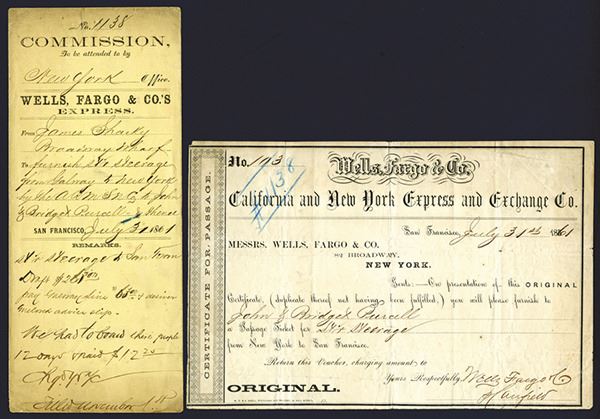 San Francisco, July 31, 1861, Lot of 2 items. Wells, Fargo & Co., "California and New York Express and Exchange Co.", Original Certificate for Passage, A number of remarks on reverse. Accompanying original envelope with the same dates indicates this was sent from James Shauky at Broadway Wharf to John and Bridget Purcell and requested Steerage passage for (six?) from New York to San Francisco. It appears the origin of the trip began in Galway, Ireland. Rare Wells, Fargo & Co. Document and first time seen by cataloger. Choice Fine Condition.