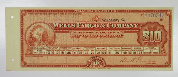 $10, Orange red on light yellow paper, Native American on left, Foreign currency conversion on bottom, back with list of offices that accept the traveler's checks. S/N 1276547, About Uncirculated. ABNC.