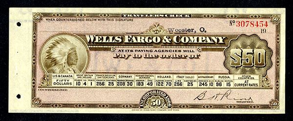 Wooster, Ohio. 19-- (ca.1900-1920). $50. Uncancelled. Vignette of Native American on left. Brown border with light brown undertint. Middle of check has currency valuations of equivalent to $50 U.S. of 8 different countries or regions. Note appears uncirculated but there is a light diagonal fold on the top right corner. ABNC. Scarce traveler's check.