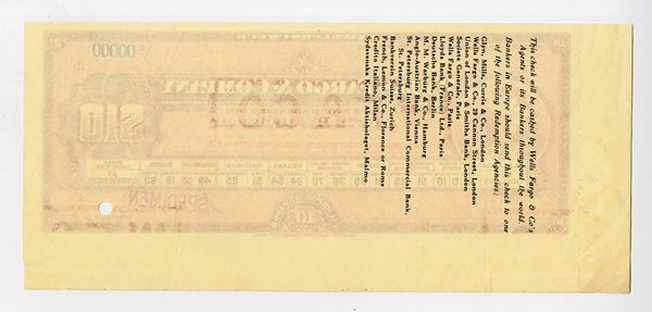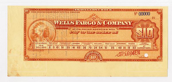 Specimen Traveler's Check, $10, Native American Indian chief at left, Red on light yellow paper, Different denominations listed above signature blocks, Back with locations of corresponding banks, Specimen overprints, POC's, Uncirculated, ABNC.