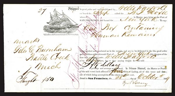 San Francisco bound to New York, Wells Fargo shipping receipt dated October 28th 1859. Wonderful ñClipper Shipî Vignette. This receipt records the shipment of ñOne box of Human Remainsî sent from San Francisco, CA. to New York. Receipt is in Very Fine Condition very minor centralized pinholes on left side not into the design, mounting remnants on verso mentioned for accuracy