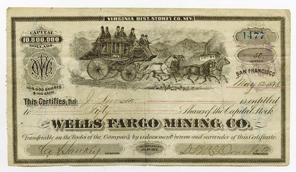 Virginia District, Storey County, Nevada. (Issued in San Francisco, CA). 50 Shares, Issued and uncancelled, Black on white with no underprints, Racing stage coach on top over title on bottom, Extremely rare with only 3 or 4 known. The certificate shows wear with 3 small holes due to folding and multiple small pin holes on the left border area, S/N 1477, Issued to J Levanson and signed by D. McDonald as president, back has multiple signatures and handstamps for assessments.