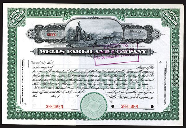 Colorado, California, 19xx (1900-1920). Less than 100 shares. Green border with "Progress" vignette with native Americans looking out over settlers. ABNCo. Specimen, XF, Well known Express and Banking company. Rare and very attractive certificate.