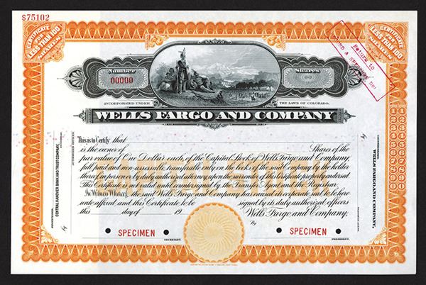 Colorado, <100 Shares, Specimen stock certificate. Black on orange border and underprint, "00000" serial numbers and POC's. XF condition. Vignette of Native Americans viewing "Progress". Rare financial certificate from this historic company. XF, ABNC.