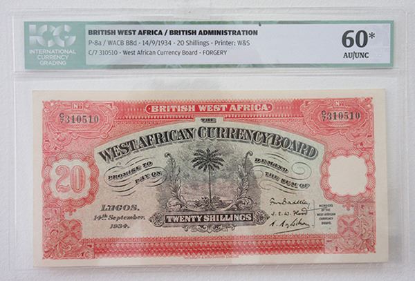 Lagos, British West Africa, British Administration. 14th September, 1934. 20 Shillings, P-8a, WACB B8d, Black on red border and light green underprint, back blank with denomination in Arabic letters. S/N C/7 310510, ICG graded AU/Unc 60*. Attractive reference contemporary forgery note. Original printer W&S.