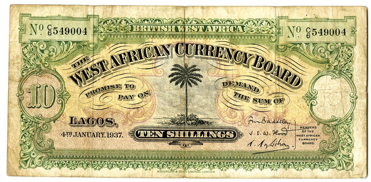 British West Africa, 1937. 10 Shillings, P-7b, Issued banknote - Lagos issue, Black with green printing and palm tree at center, Back has Arabic script at center, S/N C/6 549004, Fine condition, W&S.