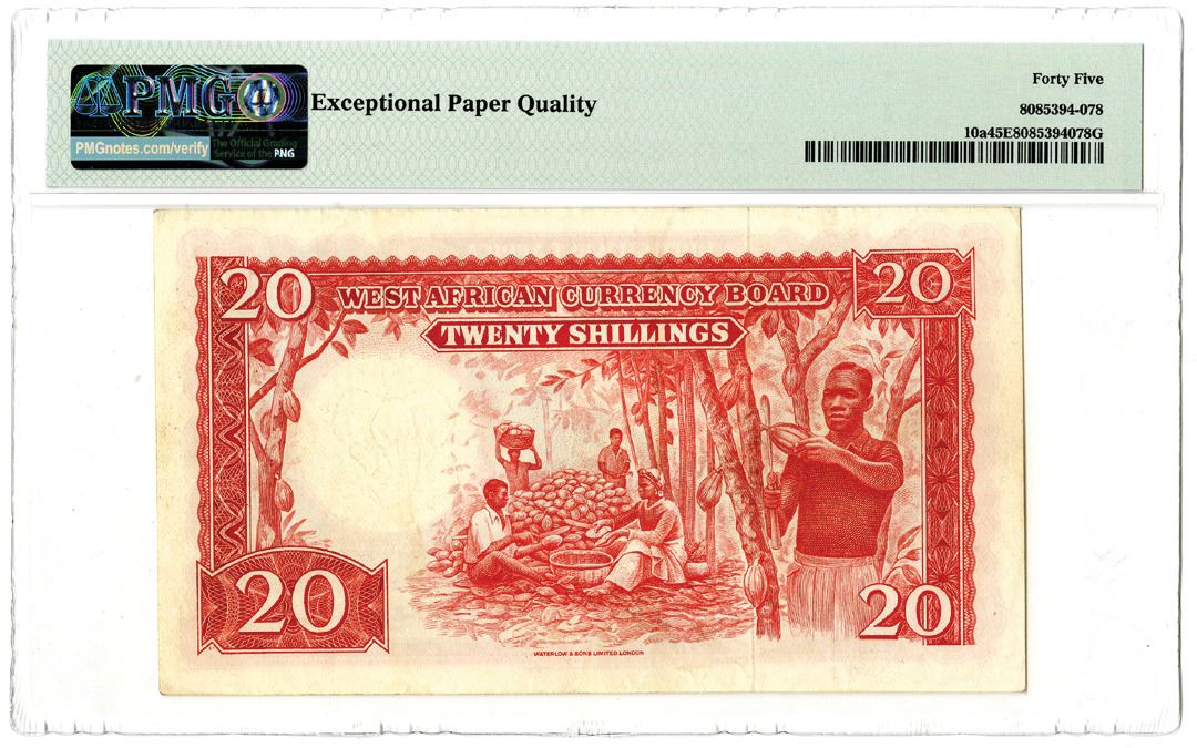 British West Africa. 1953-57. 20/- Shillings, P-10a, Issued banknote, Red on multicolor, S/N B/Q 281803, Watermark: Elephant's Head, PMG graded Choice Extremely Fine 45 EPQ. Printer: W&S.